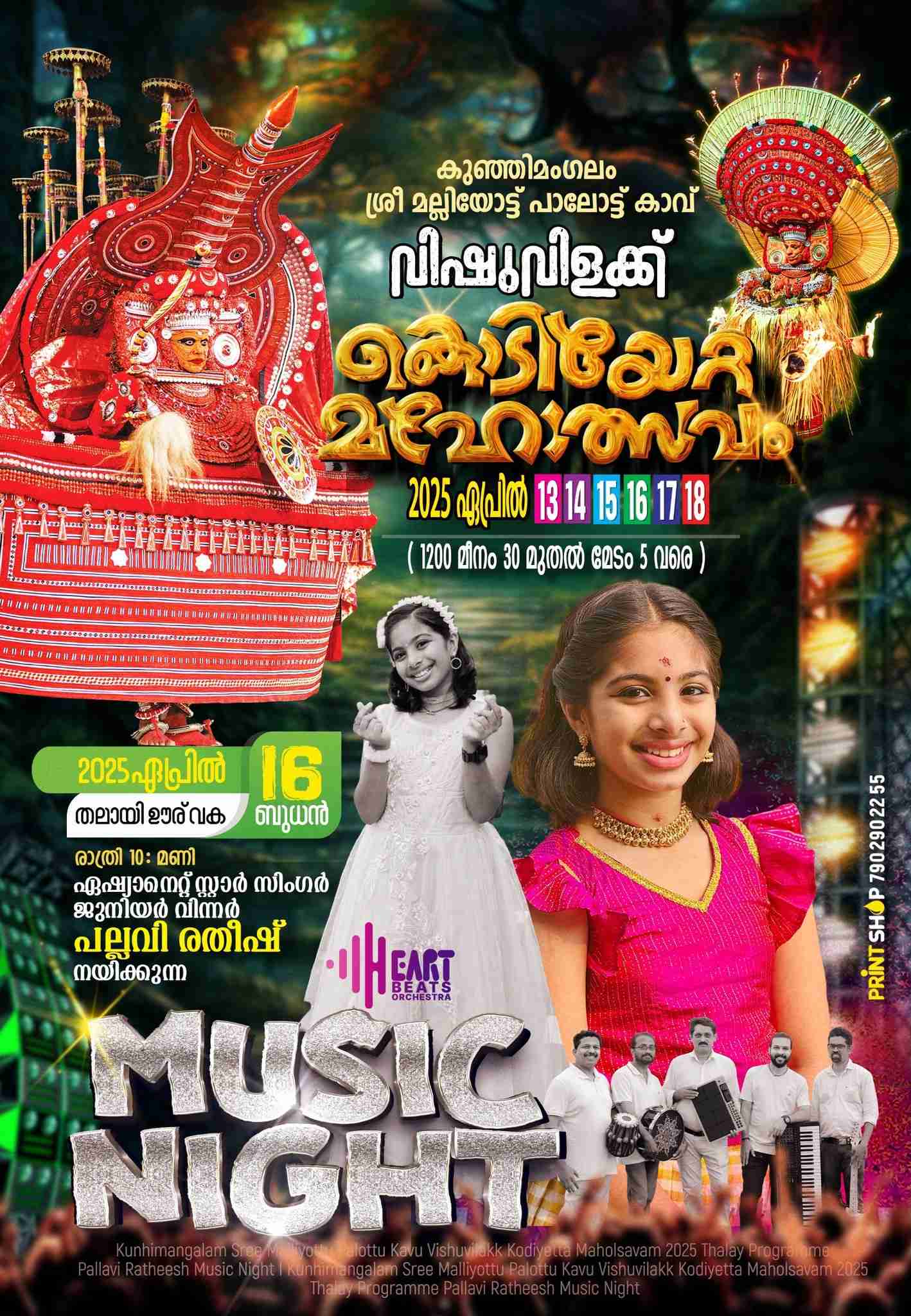 മല്ലിയോട് ഊര് കുഞ്ഞിമംഗലം ശ്രീ മല്ലിയോട്ട് പാലോട്ട് കാവ് വിഷുവിളക്ക് കൊടിയേറ്റ മഹോത്സവം 2025 മല്ലിയോട് ഊര് വക പ്രേത്യേക പരിപാടി ഏപ്രിൽ 14 ന്... മല്ലിയോട് ഊര്